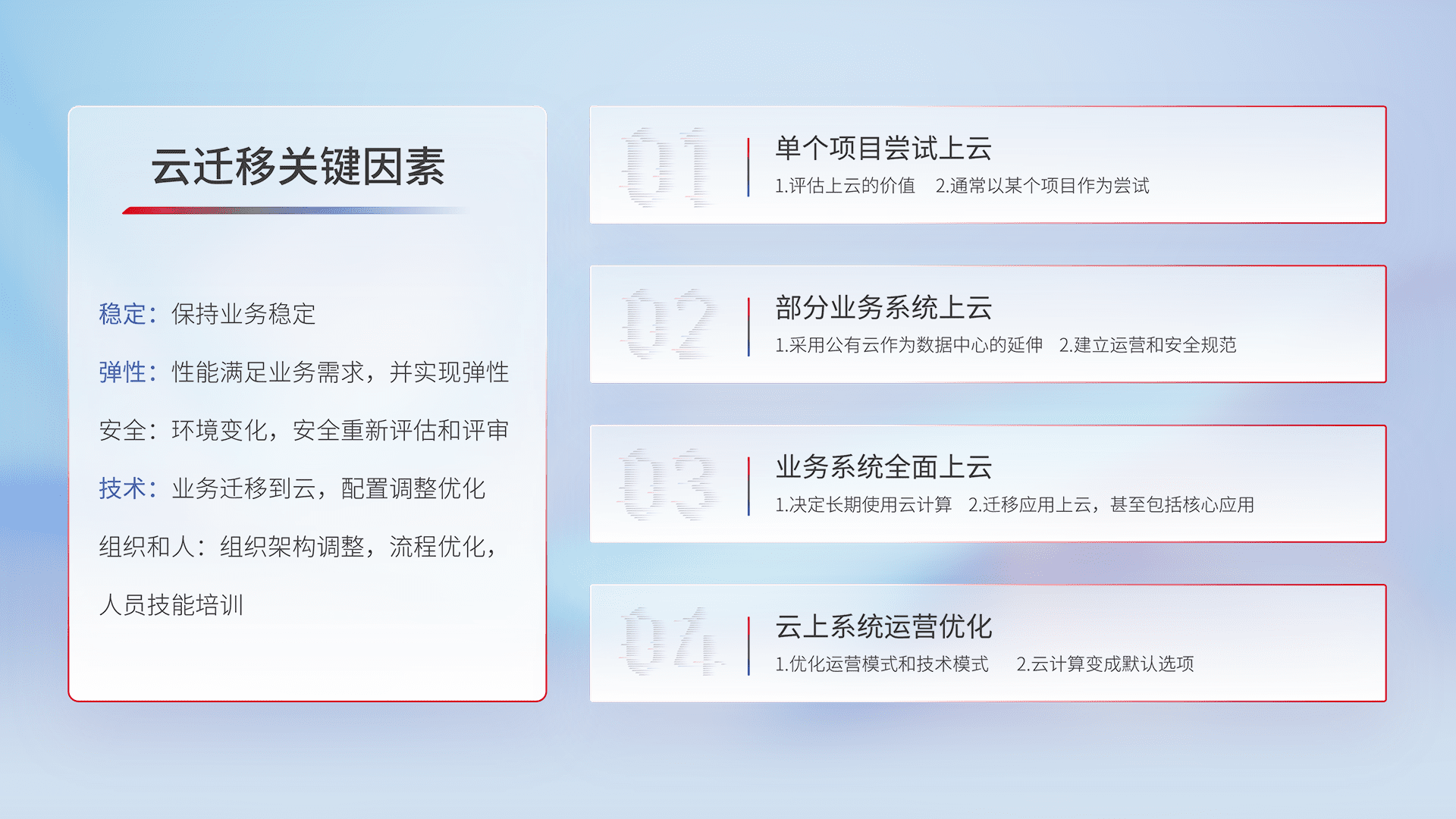 结合实际业务,,从规划设计、、云平台选型、、云原生改造、、数据迁移、、、集成交付,,,迁移全过程为客户识别最佳上云路径,,做好风险识别管理,,,,设计网络架构、、、、身份权限、、、、安全审计合规、、、、操作审计、、、日志审计、、、监控告警策略、、多站点容灾设计等,,,,对云上基础设施进行整体规划,,提升IT治理水平,,,,以满足弹性、、、、高可用、、、、高性能的需求。。。。