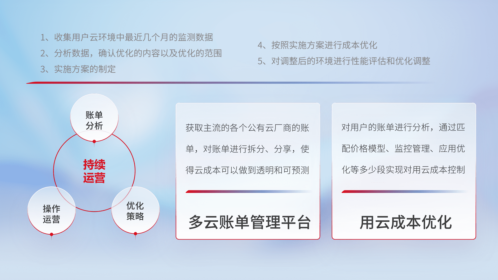 通过多云纳管,,以统一的资源数据模型把客户的云资源进行抽象和封装,,,进而实现对多云资源的统一操作,,,保障云资源管理的可靠性、、稳定性与可用性。。。量身定制化运维内容,,配置、、、、开发运维、、、、补丁管理、、备份、、监控、、、、认证和访问管理、、、、审计和日常巡检等,,保障在用云过程中的可靠度,,稳定度以及高可用率。。。。