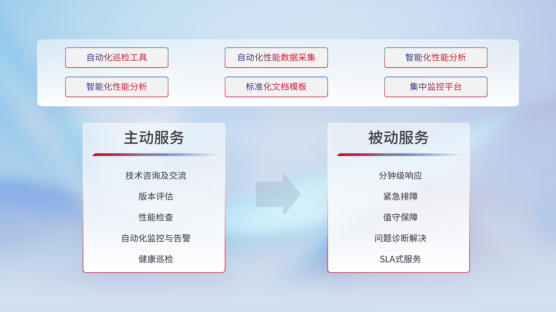 智能化工具和标准化文档,,,,保障服务质量,,,,提供主动服务(包含技术咨询、、、版本评估、、性能检查、、、自动化监控与告警、、、健康巡检)和被动服务包含(分钟级响应、、紧急排障、、、值守保障、、、、问题诊断解决、、SLA服务)。。。。