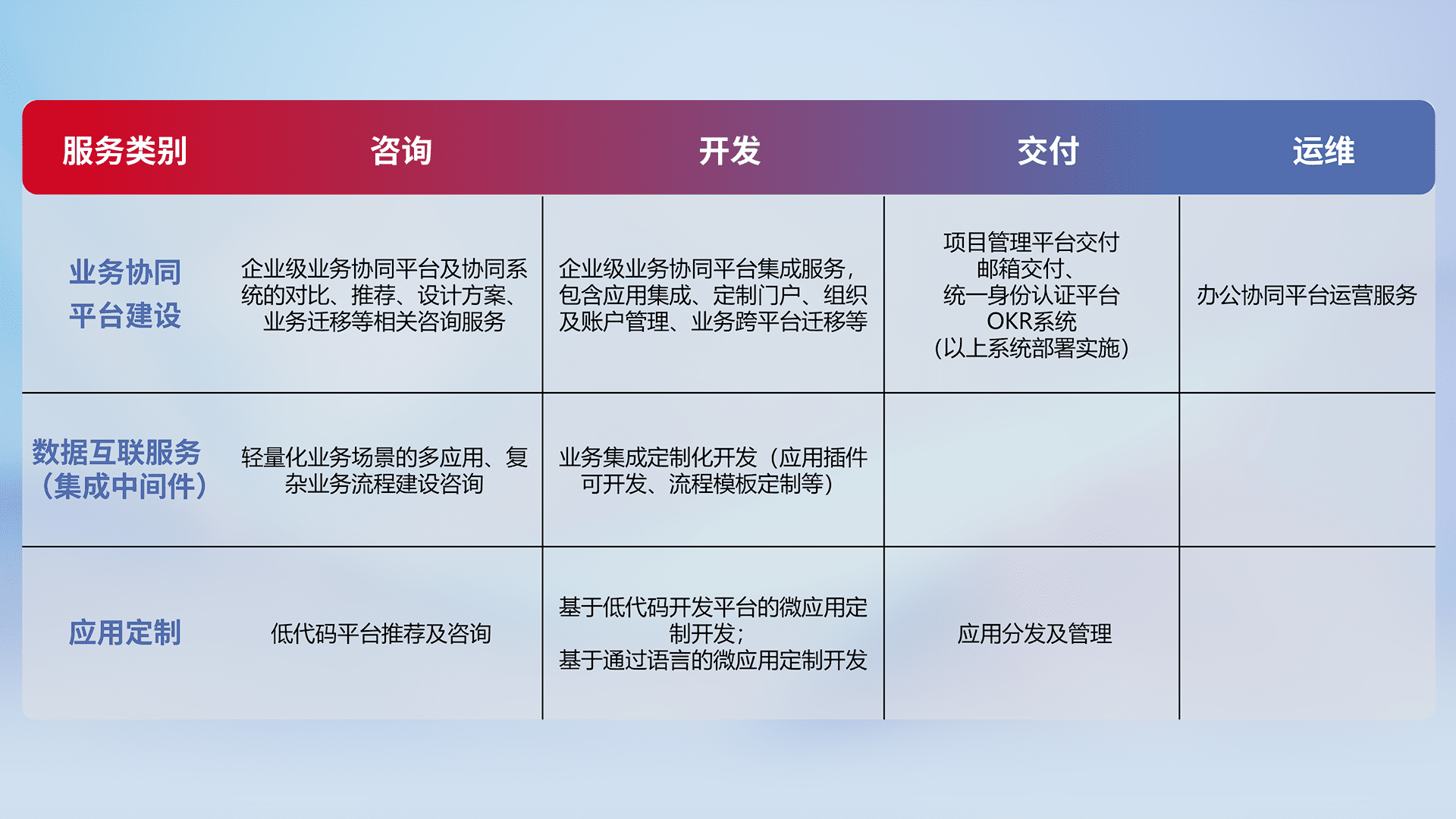 针对钉钉、、、企微、、、、IDaas等平台级产品提供产品的规划、、、方案、、、交付、、、、定制化开发等服务,,,实现如统一协同办公、、、智能客户服务、、、、混合会议管理、、、智能数据查询、、等业务场景,,实现数字化转型。。。